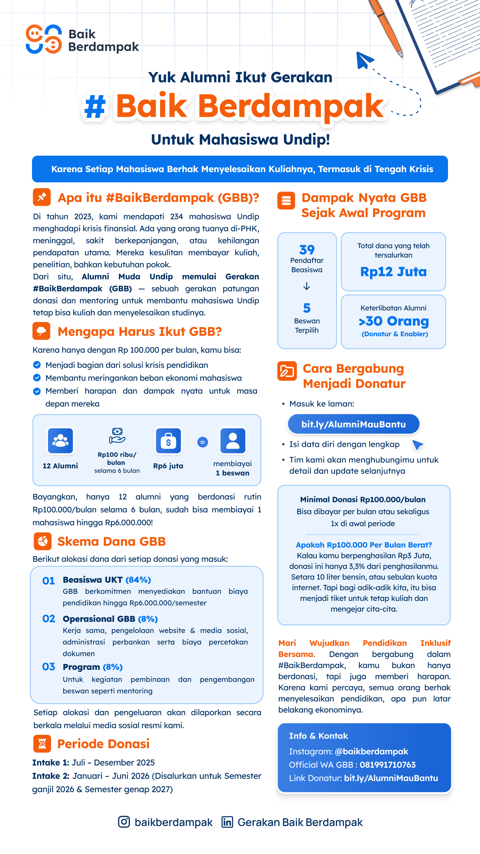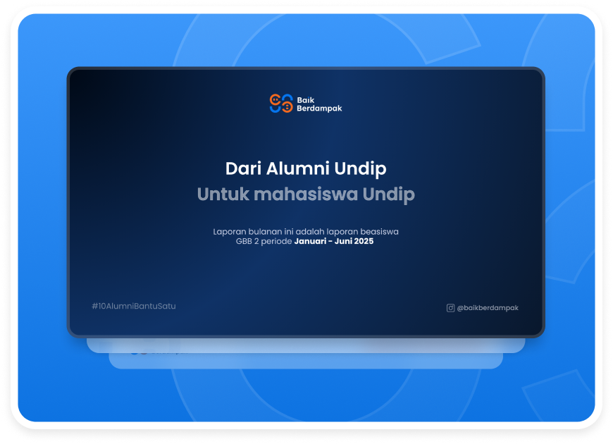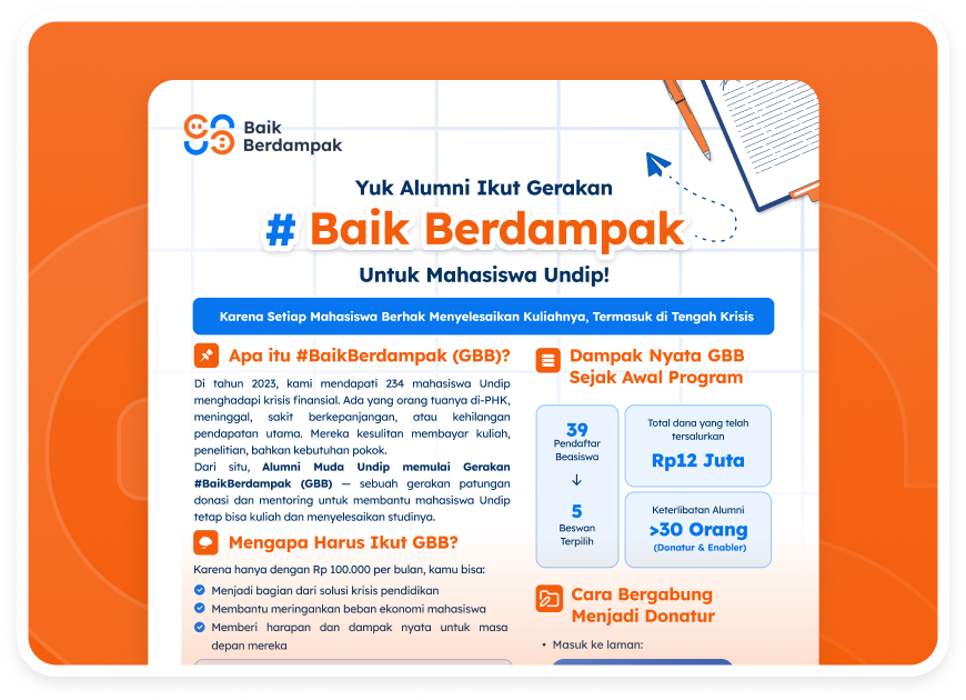 Beasiswa Baik Berdampak tidak mensyaratkan IPK tinggi, karena kami percaya bahwa kebutuhan harus diutamakan. Dengan sistem #10AlumniBantuSatu dan pelaporan keuangan real-time, donasi Anda dikelola secara transparan dan berdampak langsung. Anda juga berkesempatan untuk berkontribusi lebih dari sekadar finansial—menjadi mentor, narasumber, atau penggerak perubahan. Mari bersama menciptakan kebaikan yang benar-benar berdampak.